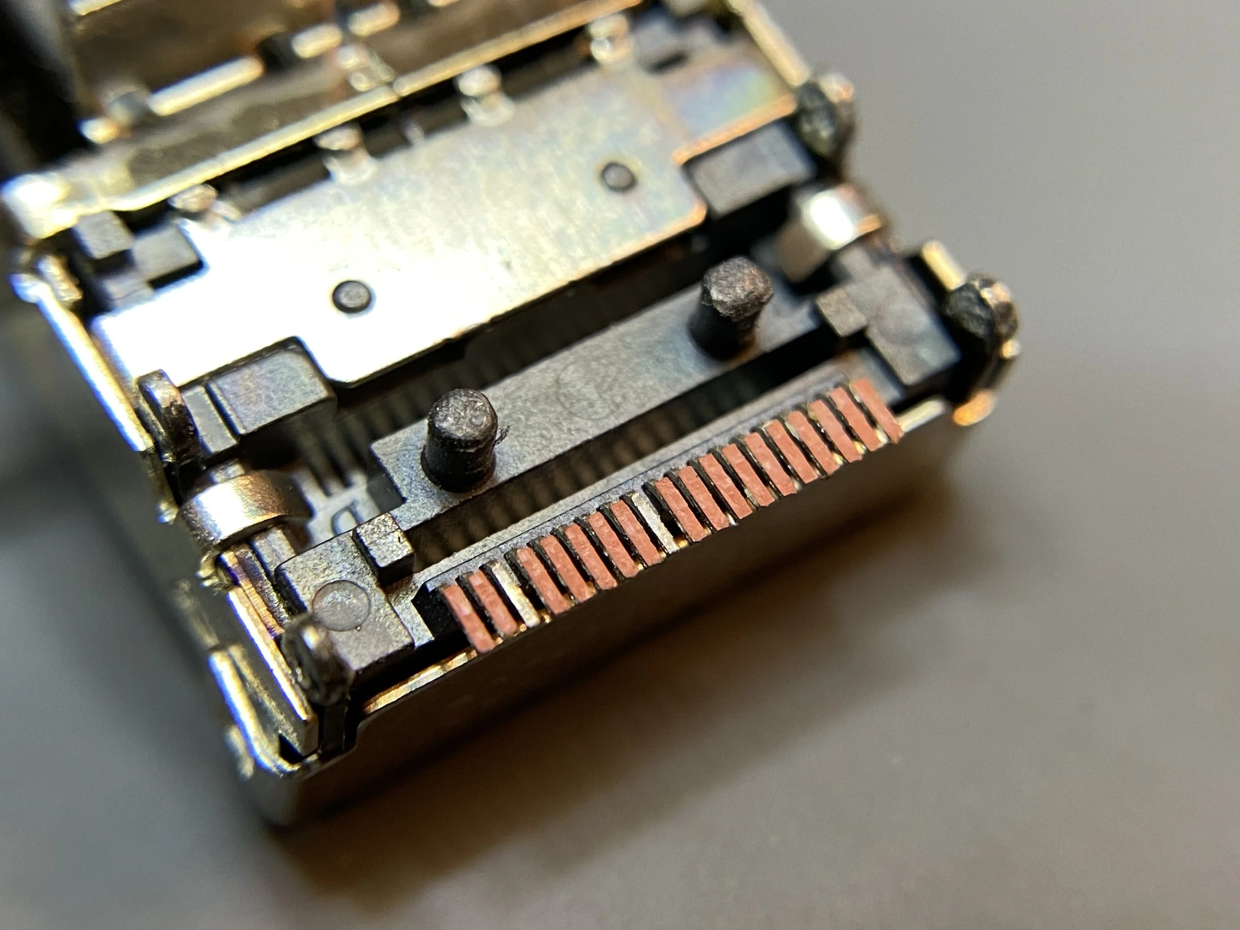 Close-up of an Xbox Series X HDMI port showing damaged internal pins.